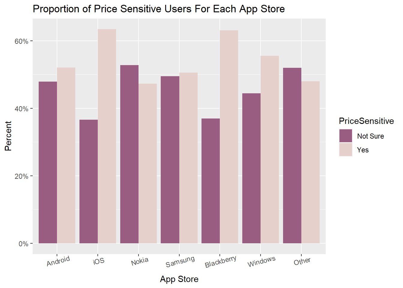 In our analysis, we classify respondents who chose ‘price’ as a main factor influencing app download decision as ‘price-sensitive’ and the rest as ‘not sure’. The bar chart below demonstrates the proportion of price-sensitive and non-price-sensitive (not sure) user for each app store.