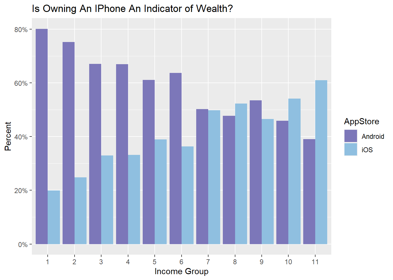 Taking into account of socioeconomic development across countries and different currency exchange rate, Lim et al. divide income level into 11 groups while designing the questionnaire: higher group number represents higher the income level. The proportion of Apple user rises along with income level while the proportion of Android user shows an inverse pattern: the proportion of Apple user is approximately 20% higher in level 11, and the proportion of Android user is about 60% higher in level 1.