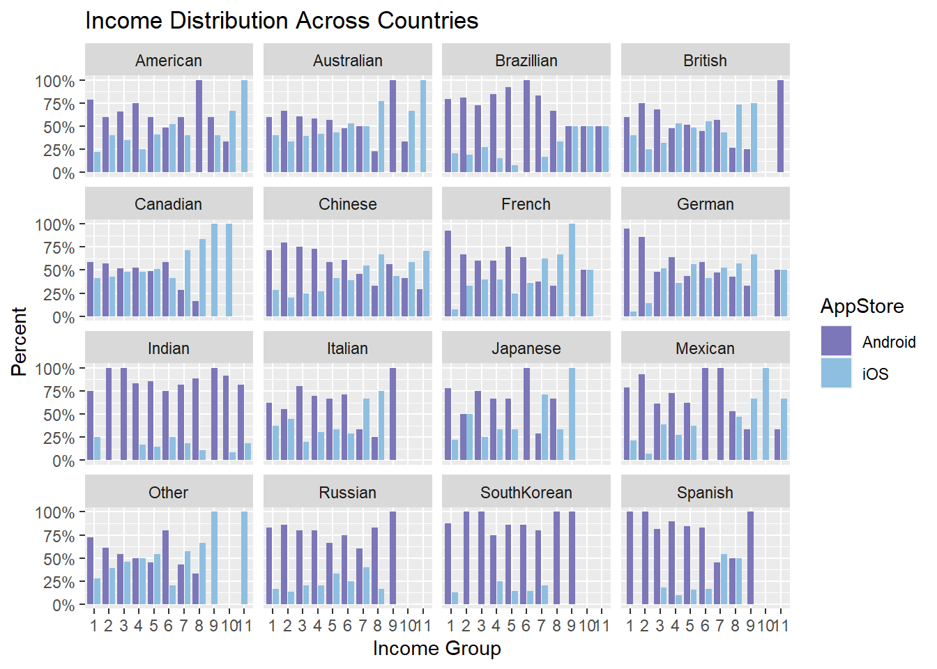 Considering the massive global market share of Android and local brand dominance (e.g. Apple has market share lead over Android in North America), we create a bar char of user proportions for Android and iOS faceting by user nationality to investigate whether user income pattern is a global trend.
