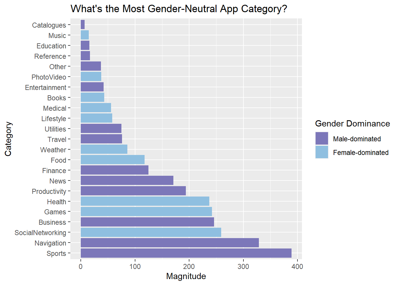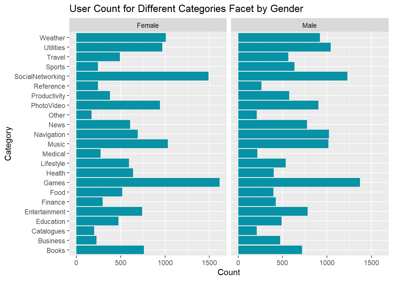 To find gender-neutral app categories, we first calculate the difference between the number of male user and female user for each app category. If the number of male user is greater than the number of female user, then the category is classified as male-dominated category with a magnitude measured by the absolute value of the difference. We define female-dominated category in a similar fashion. The categories are then sorted by magnitude in ascending order, with more gender-neutral categories showing up on top and more gender-dominated categories at the bottom. We pick the top 4 most gender-neutral categories and analyze the distribution of user demographic data in the following section.