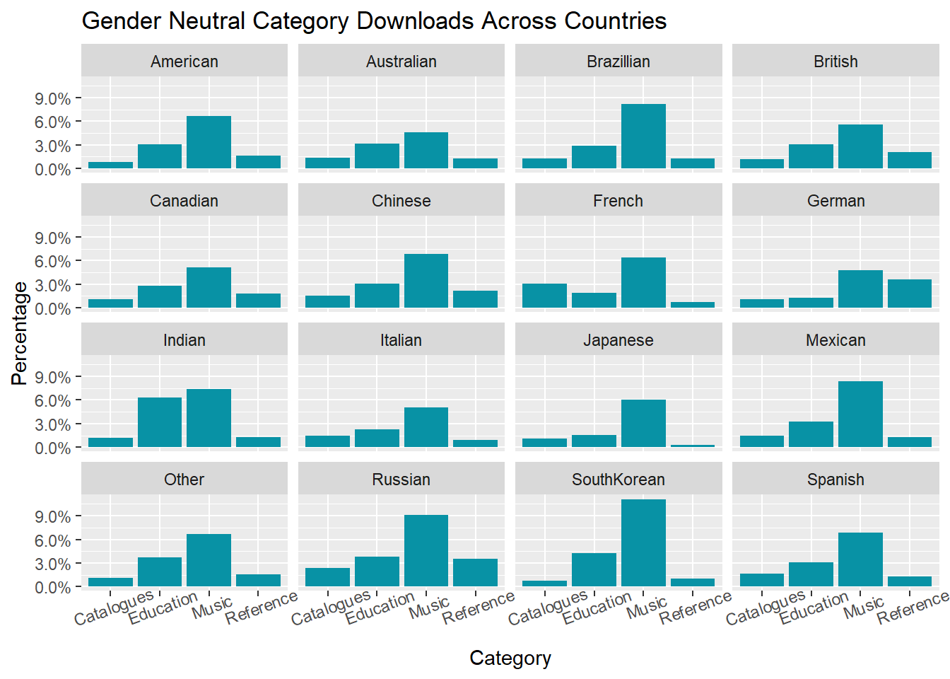 As the number of users across countries varies, we compute the percentage of users for each gender-neutral category within each country. Clearly, music app has gain popularity from both male and female users regardless of nationality. The pattern of user proportion by category is almost the same except for France and Germany. The second most popular gender-neutral category is Catalogues in France and Reference in Germany. Users from India are more likely to download educational apps compared with users from other countries. Cultural difference certainly plays an important role, and developers face the challenge of incorporating insights from countries and cultural differences in feature selection for their apps.