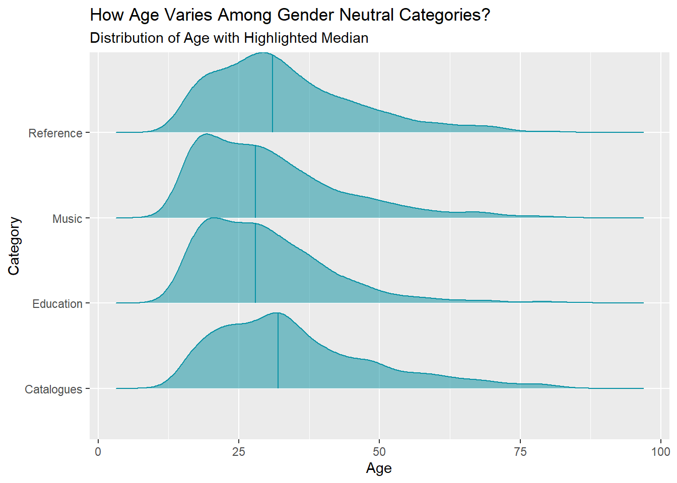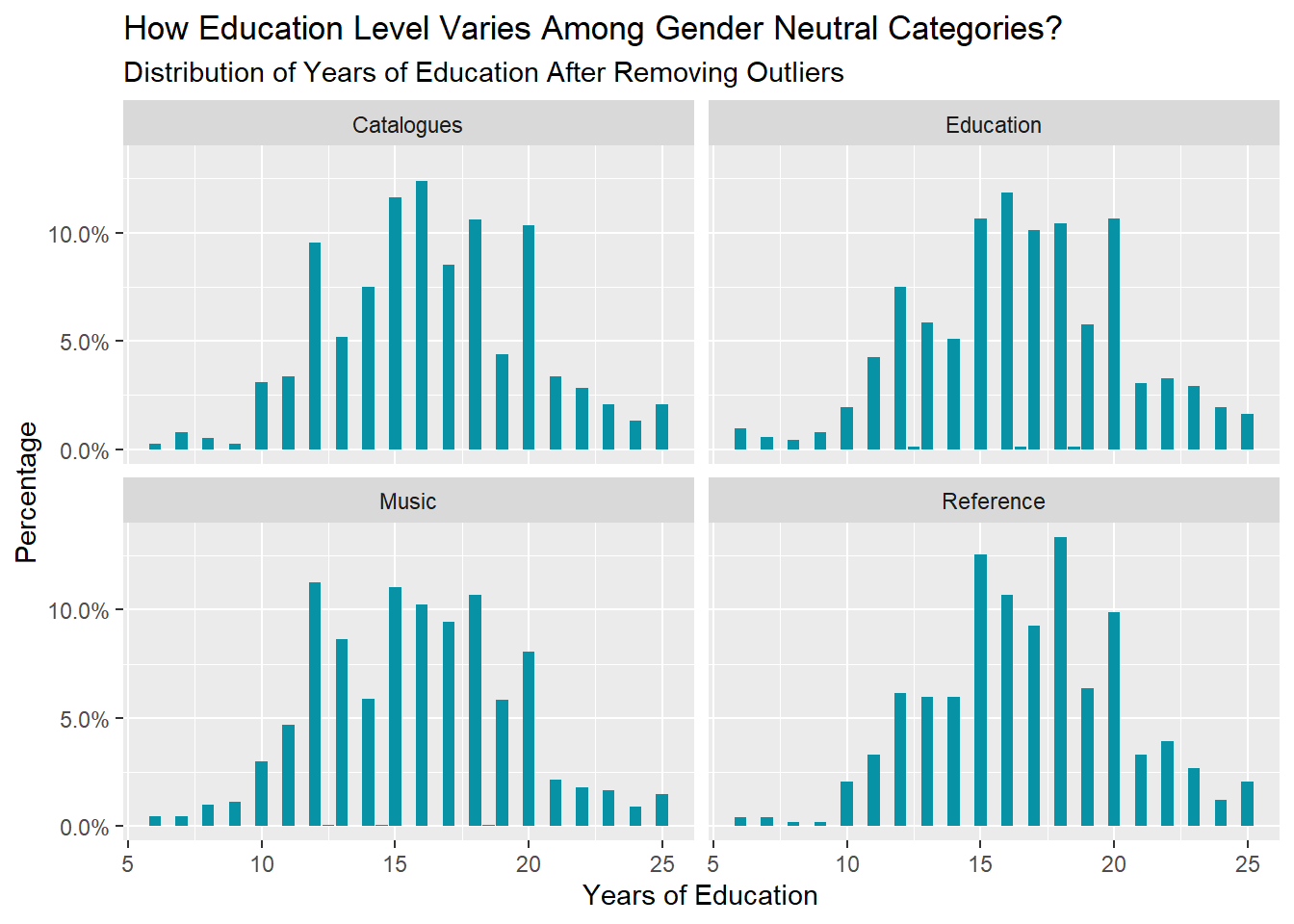 The distribution of age is approximately the same for all gender-neutral categories, and Music and Education attract more younger users. There are new perspectives regarding continuing education, and a small number of respondents claimed they have 80 years of education. However, for analysis purpose, we consider those responses as outlier and remove them using \(\pm 1.5\times IQR\) as the threshold. The distribution of years of education also show similar pattern across categories.