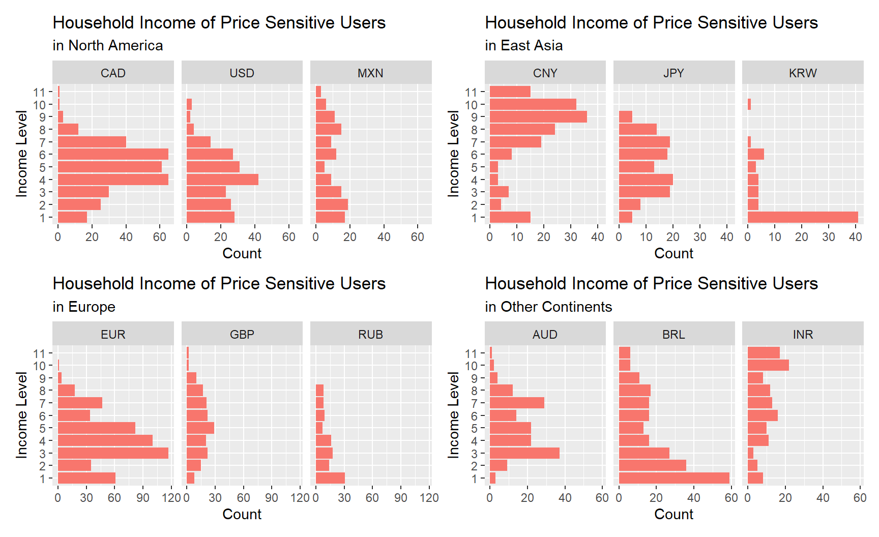 Here we are going to analyze the incomes based on the pre-divided intervals as well. Incomes are displayed in order of highest to lowest level on the y-axis (from top to bottom). For uses in the North America, there are similar distributions (close to normal) for CAD (Canada Dollar) and USD (US Dollar), while Mexican incomes appear to be more evenly distributed. CNY (Chinese Yuan) users’ incomes are clustered in a higher level. Incomes in JPY (Japanese Yen) mainly range from level 3 to 8, with no data in the highest level of 10 and 11. Most of the Korean respondents seem to be students from our guess since lots of them earn the lowest level of income. In Europe and other continents, number of the price-sensitive using EUR and BRL (Brazilian Real) appears to be larger than other countries and most observations are clustered under level 5, but for INR (Indian Rupee), there are more people having higher incomes. Overall we can see that income distributions differ a lot in each country.