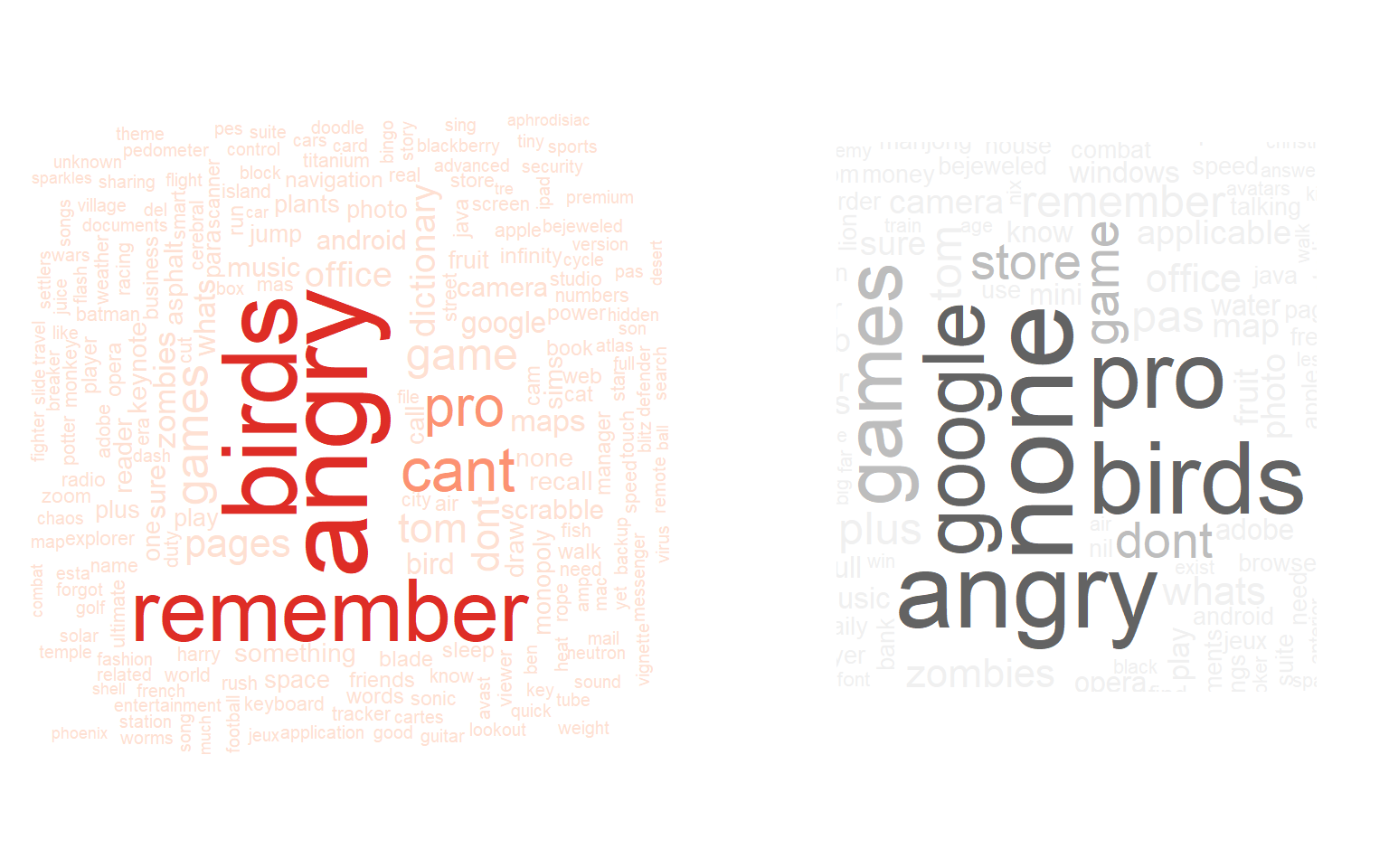 For both types of users, many answered “game(s)” (“angry birds” in particular) and an upgrade of “pro” version as the reasons why they downloaded the apps that they had in-app purchase in. Price-sensitive users (word cloud on the left) also spent money on “zombie” type of mobile games. Another obvious pattern for the price-sensitive is that they “can’t remember” the reasons for downloading apps but they do remember they’ve spent money on those apps. In the meanwhile, people that are not as price-sensitive (word cloud on the right) purchased “google” and “office” products essential for business or study.